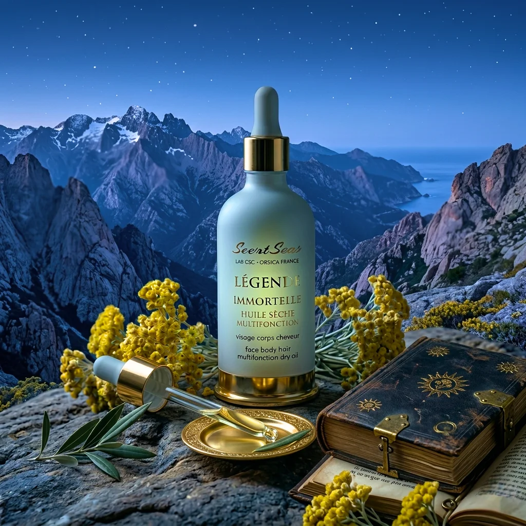 Huile sèche à l'immortelle bio corse : Légende pour une peau et des cheveux sublimés